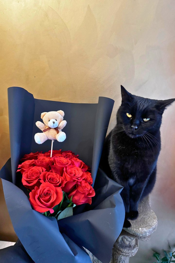 Elegantni buket crvenih ruža u luksuznom crnom pakiranju, s nježnim detaljem plišanog medvjedića. Savršen izbor za Valentinovo i posebne prilike.