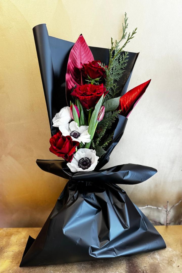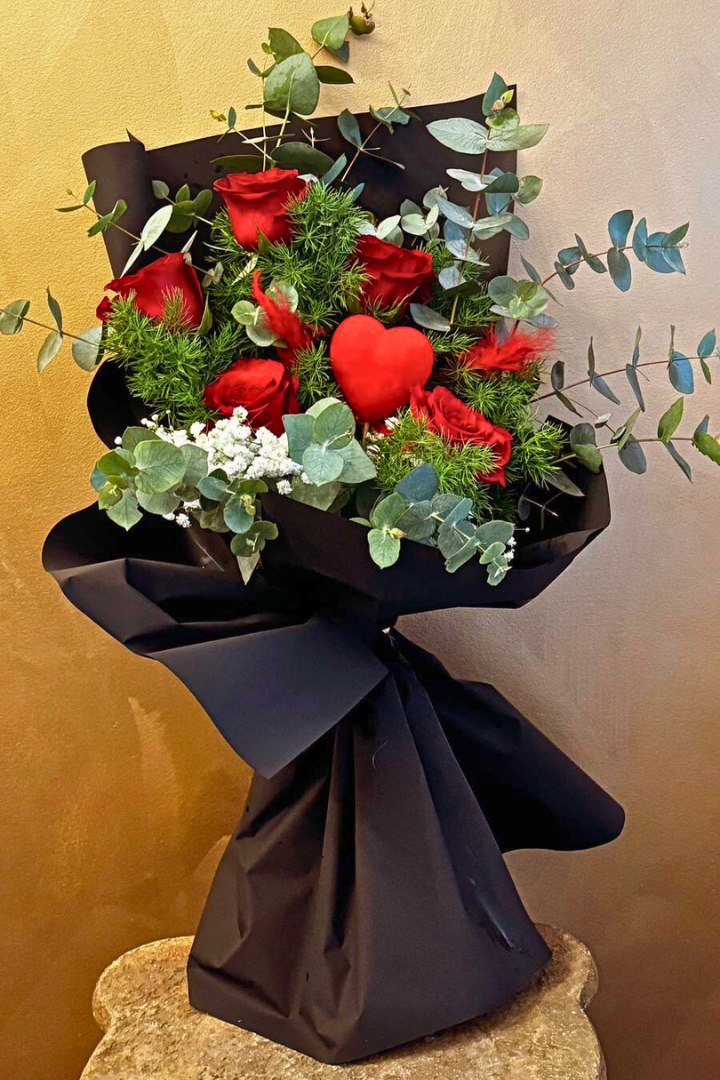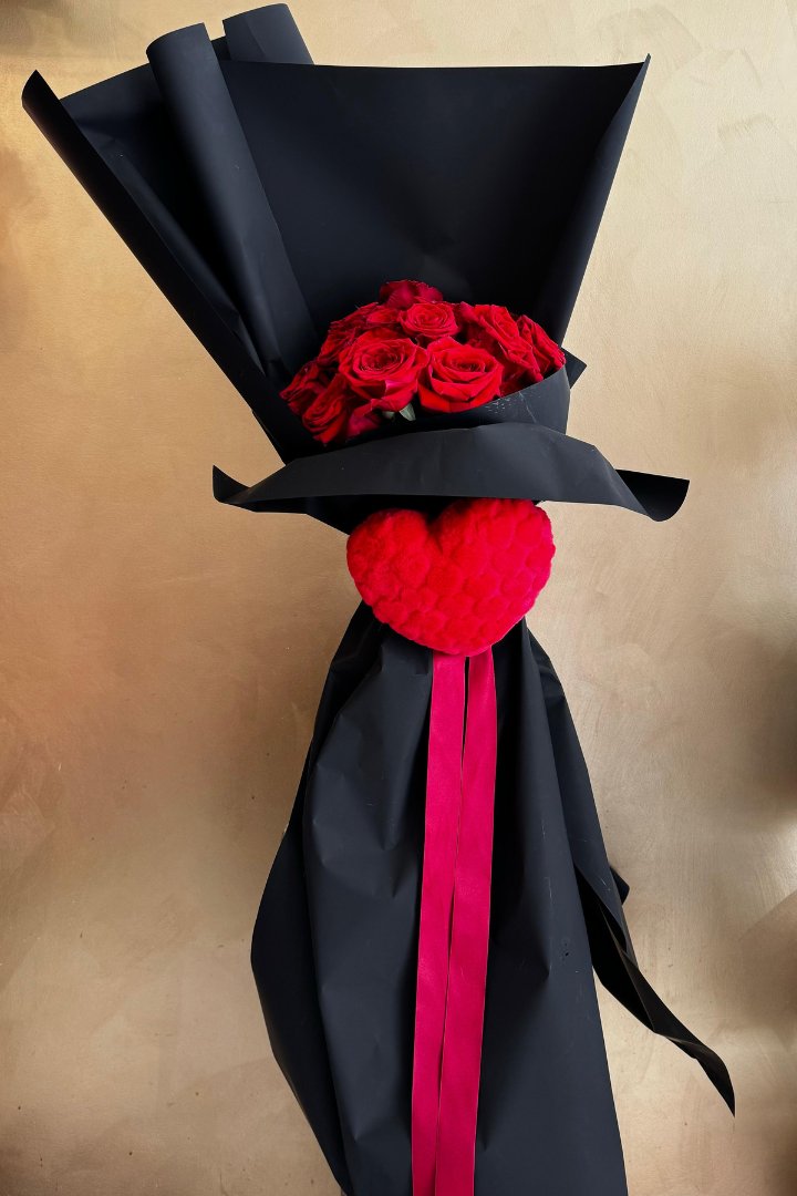 Ovaj luksuzni buket odiše sofisticiranošću i elegancijom. Kombinacija crvenih ruža, baršunastog srca i crnog papira čini ga savršenim poklonom za posebne prilike poput Valentinova, godišnjica ili rođendana voljene osobe.