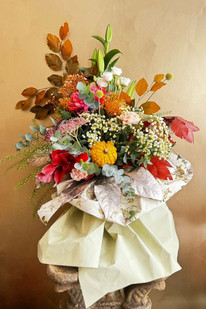 Buket koji slavi toplinu jeseni — spoj zlatnih listova, bogatih tonova crvene, narančaste i boje vina, uz dašak rustikalnog šarma. U srcu aranžmana skriva se mala dekorativna bundeva kao simbol jesenske berbe i obilja. Idealno za poklon ili dekoraciju doma u ovom čarobnom godišnjem dobu.