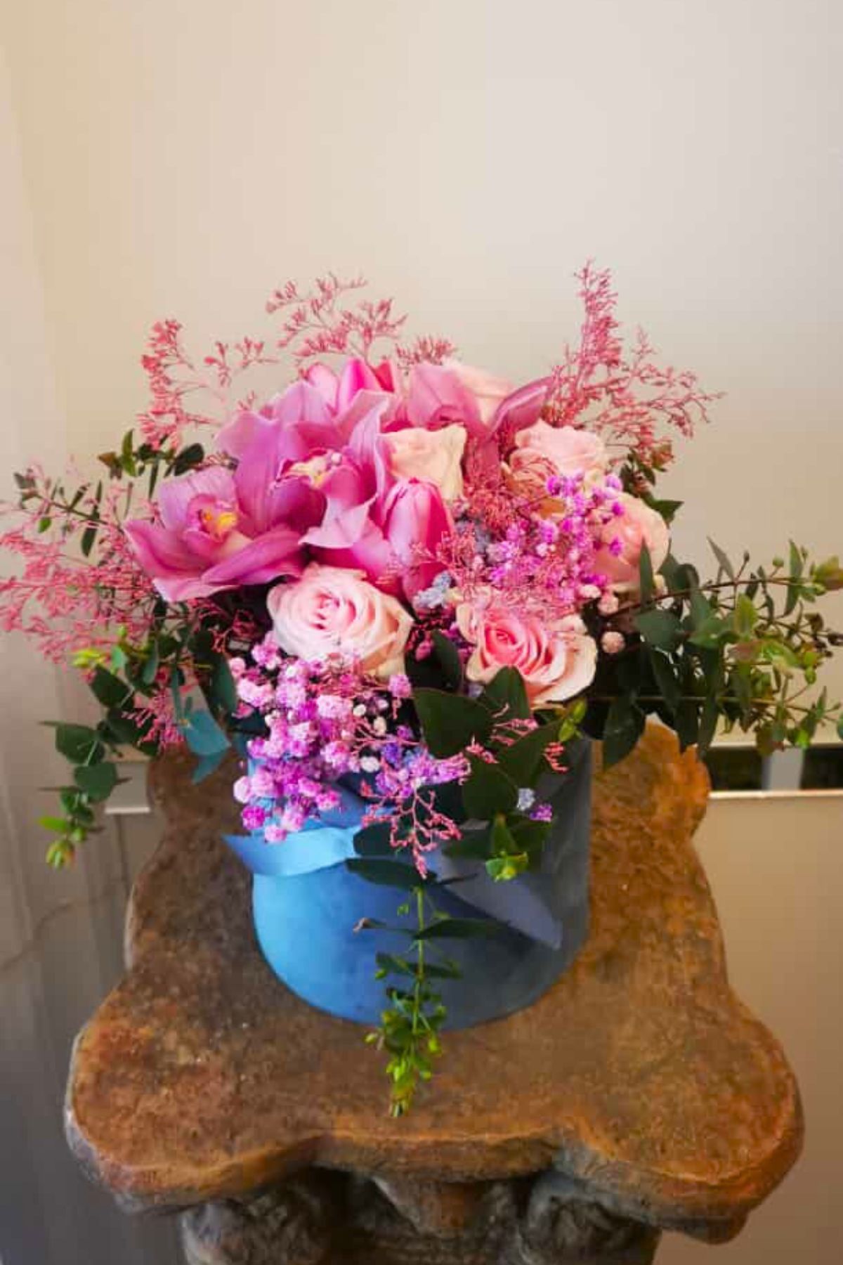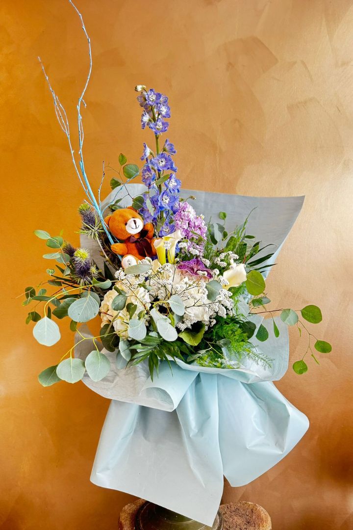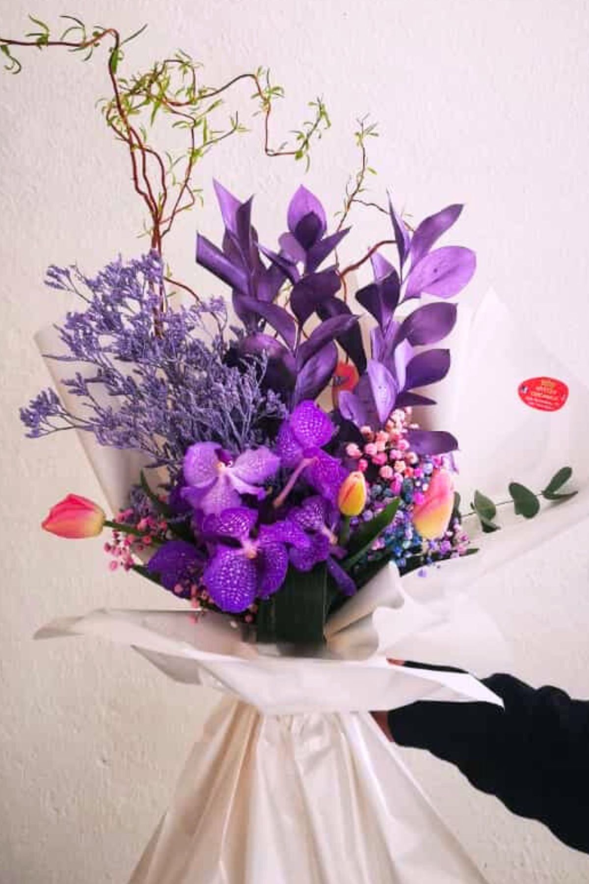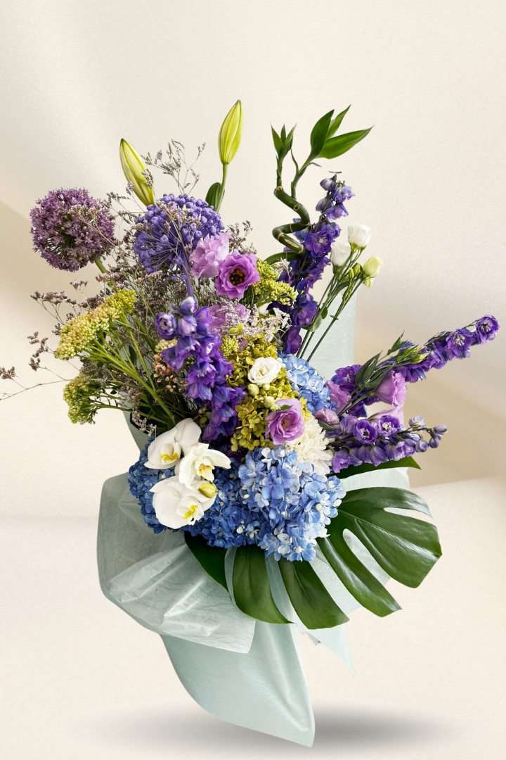 Elegantna kombinacija plavih, ljubičastih i bijelih tonova hortenzije, lizijantusa i orhideje – buket koji spaja svježinu i luksuz.