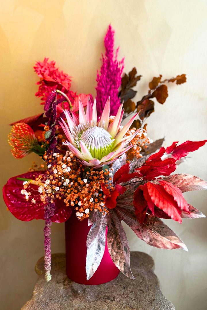 Topla kompozicija u tonovima crvene i bakrene, s kraljevskom proteom u središtu. Inspirirana bojama jeseni i zalaska sunca – elegantan poklon ili dekoracija s karakterom.