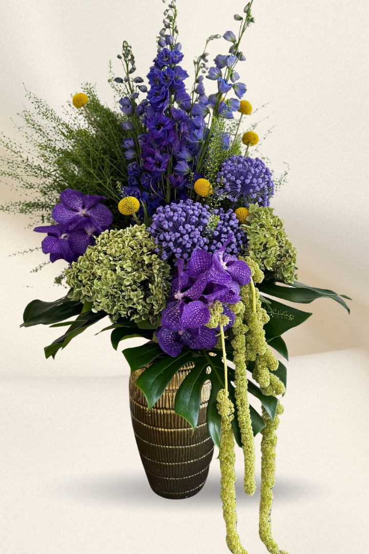 Ekskluzivni cvjetni aranžman u raskošnoj zlatnoj vazi, izrađen od hortenzija, vandi orhideja, alliuma, delphiniuma i viseće amarante. Naglašeni kontrasti ljubičastih i zelenih tonova uz žute detalje daju aranžmanu modernu, luksuznu notu. Idealan je kao dekoracija za dom, ured ili poseban poklon kojim želite ostaviti snažan dojam.
