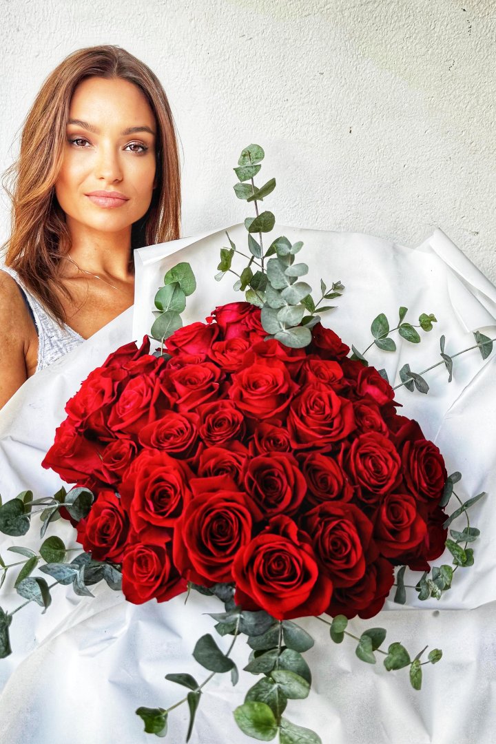 Impresivan buket raskošnih crvenih ruža, pažljivo oblikovan u punu, elegantnu formu i obogaćen grančicama eukaliptusa. Simbol duboke ljubavi, strasti i bezvremenske romantike. Savršen izbor za posebne trenutke kada želite ostaviti snažan dojam.