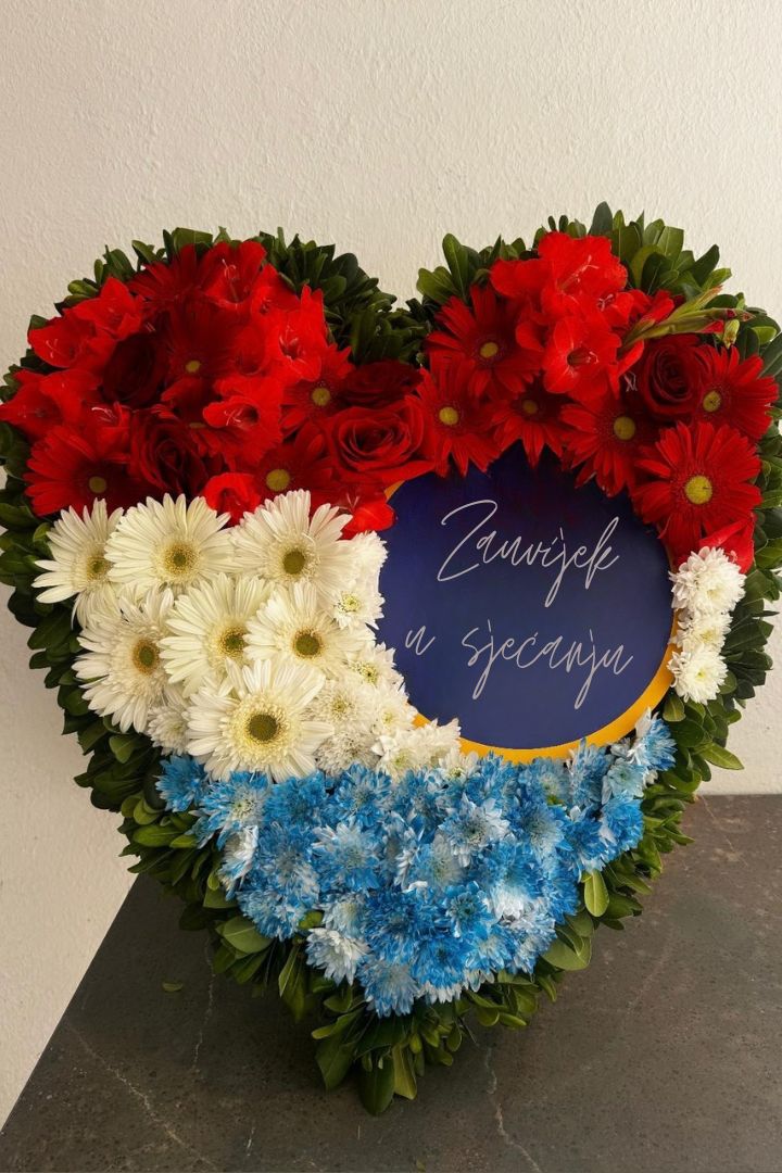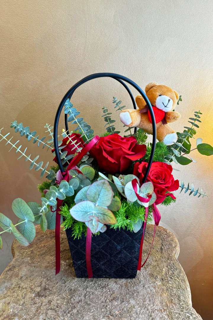 Ovaj predivan aranžman spaja crvene ruže, simbol strasti i ljubavi, s nježnim zelenilom eukaliptusa i čempresa. Kao poseban dodatak, plišani medvjedić s crvenim srcem donosi toplinu i emociju, čineći ovaj aranžman savršenim izrazom nježnosti i pažnje.