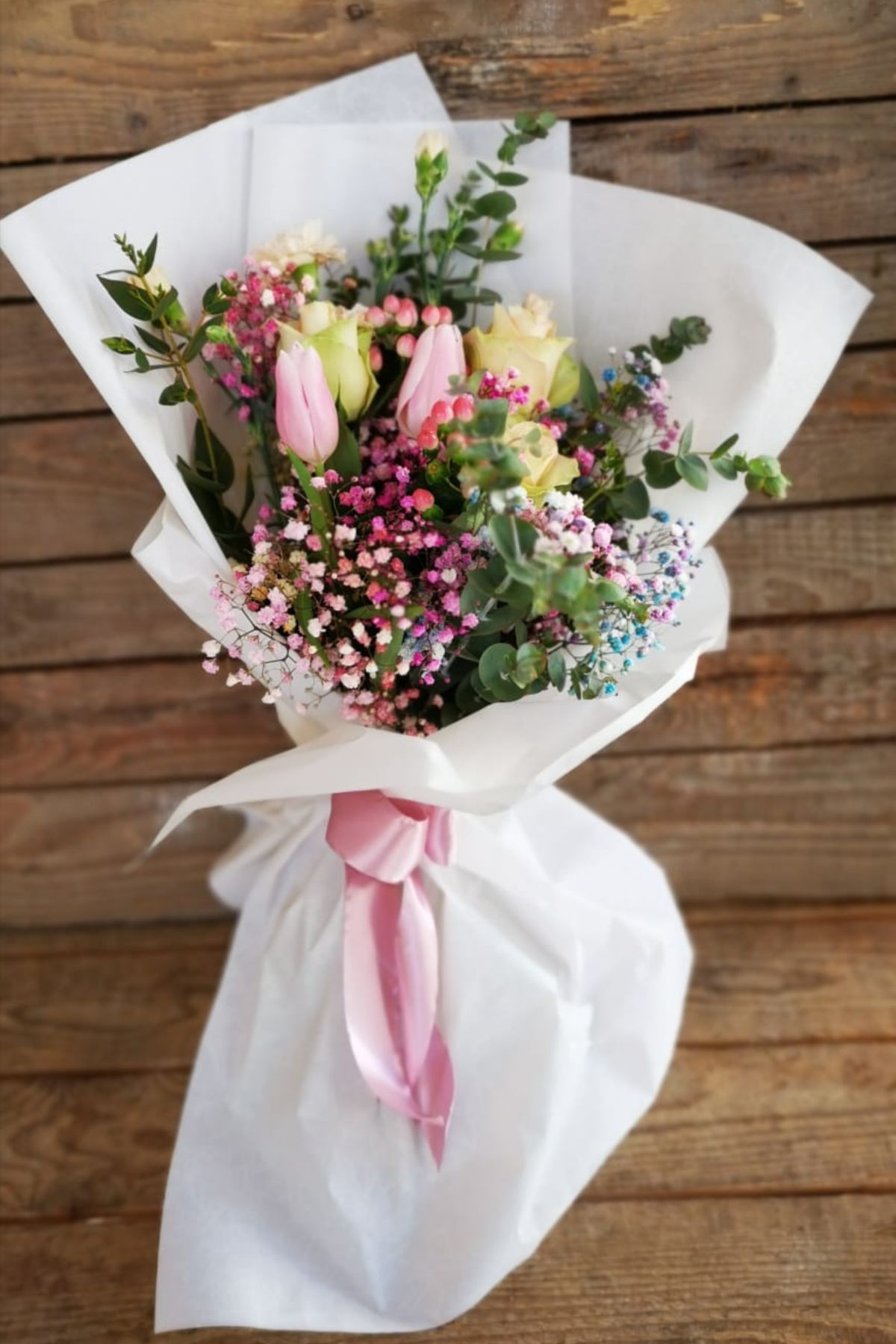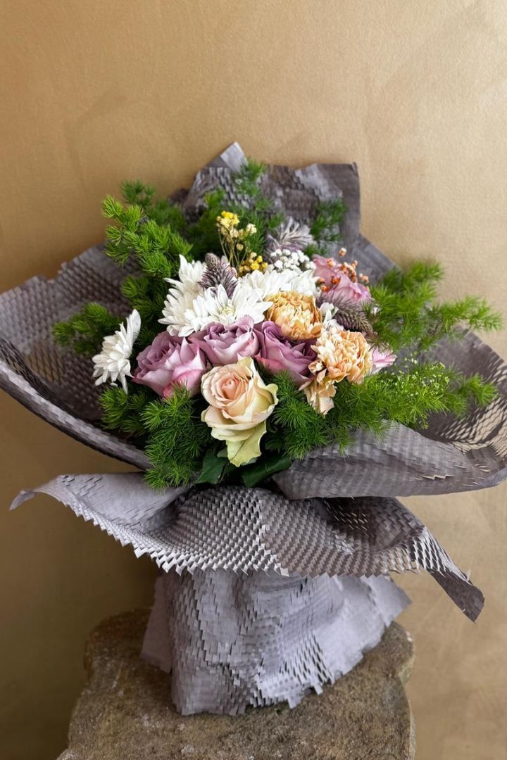 Šarmantni i vibrantni buket izrađen od raznolikog sezonskog cvijeća u toplim i živopisnim bojama. Kombinacija tulipana, anemona, protea, krizantema i delikatnog zelenila upotpunjena je dekorativnim grančicama i pažljivo umotana u elegantan bijeli papir. Idealan izbor za posebne prilike ili kao poklon koji ostavlja dojam.