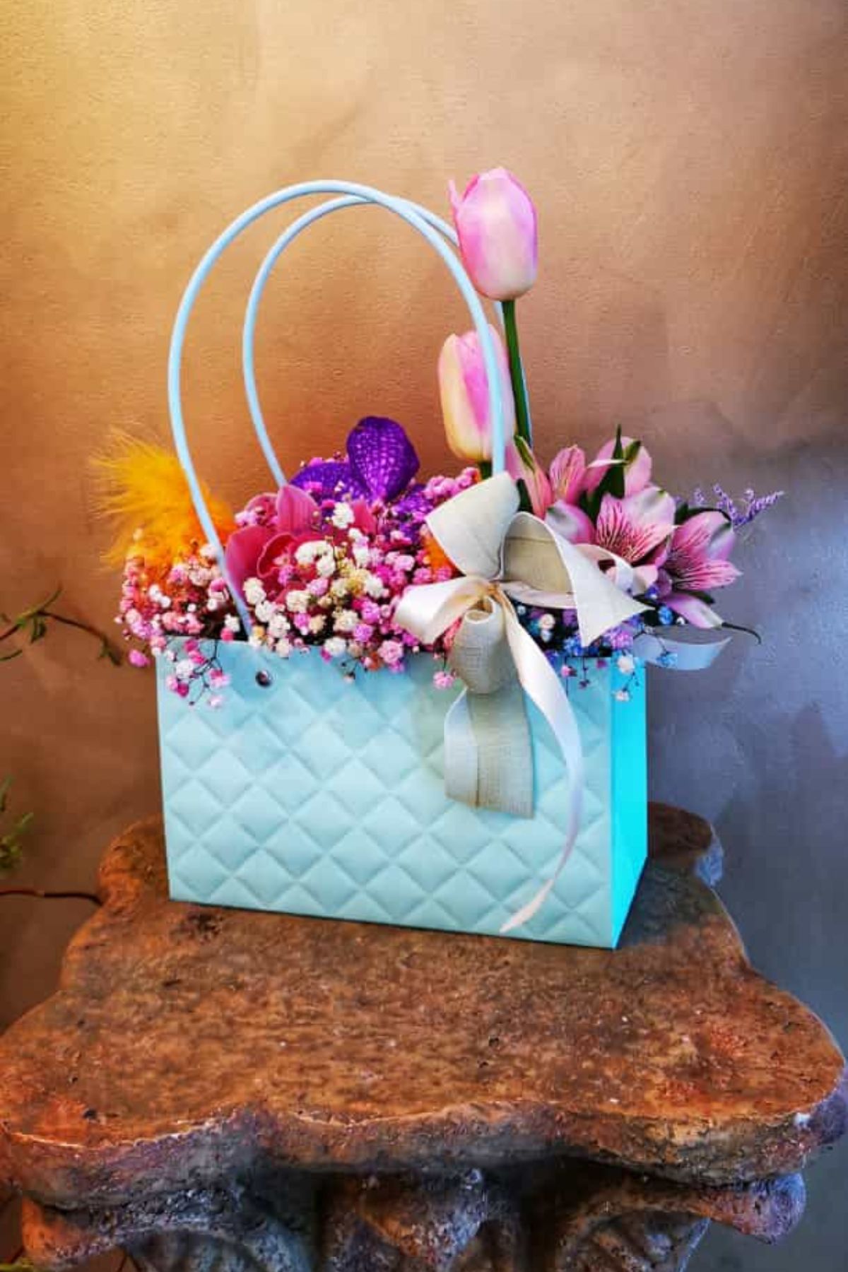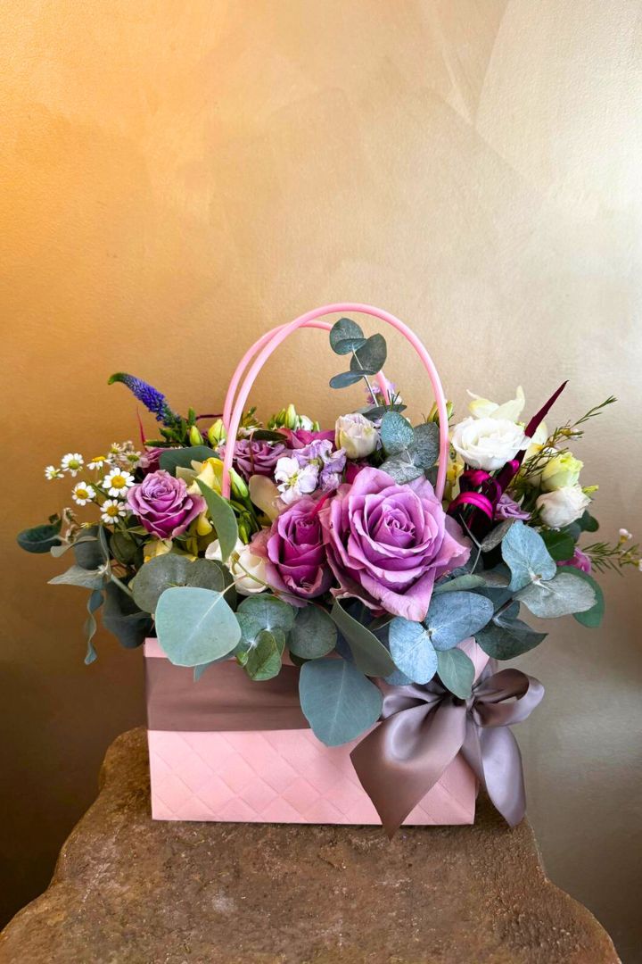 Cvjetna torbica koja priča svoju priču – ispunjena nježnim ružama u ljubičastim tonovima, svježim eukaliptusom i sitnim cvjetovima koji unose dašak romantike. Elegantna mašna zaokružuje cijelu kompoziciju i čini ovaj aranžman savršenim poklonom za svaku posebnu priliku.