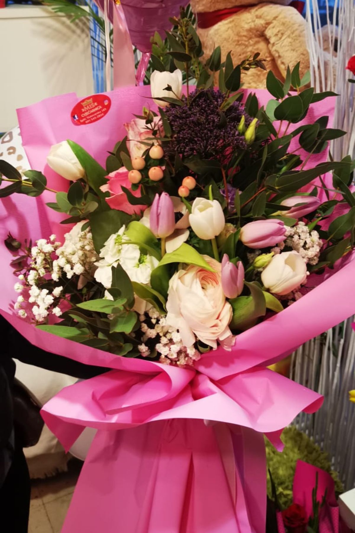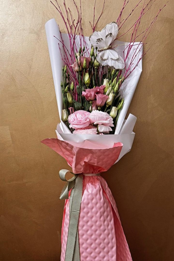 Elegantni buket nježnih ružičastih nijansi, idealan za romantične prilike ili znak pažnje dragoj osobi. Sastavljen od lisianthusa, ranunkula i ruža, obogaćen ručno obojenim grančicama i dekorativnim leptirićem koji unosi dozu šarma. Umotan u luksuzni roza papir s teksturom i ukrašen satenskom mašnom, ovaj buket odiše sofisticiranošću i toplinom. Savršen izbor za rođendane, godišnjice, povodom Dana Žena ili jednostavno kao znak ljubavi i pažnje.