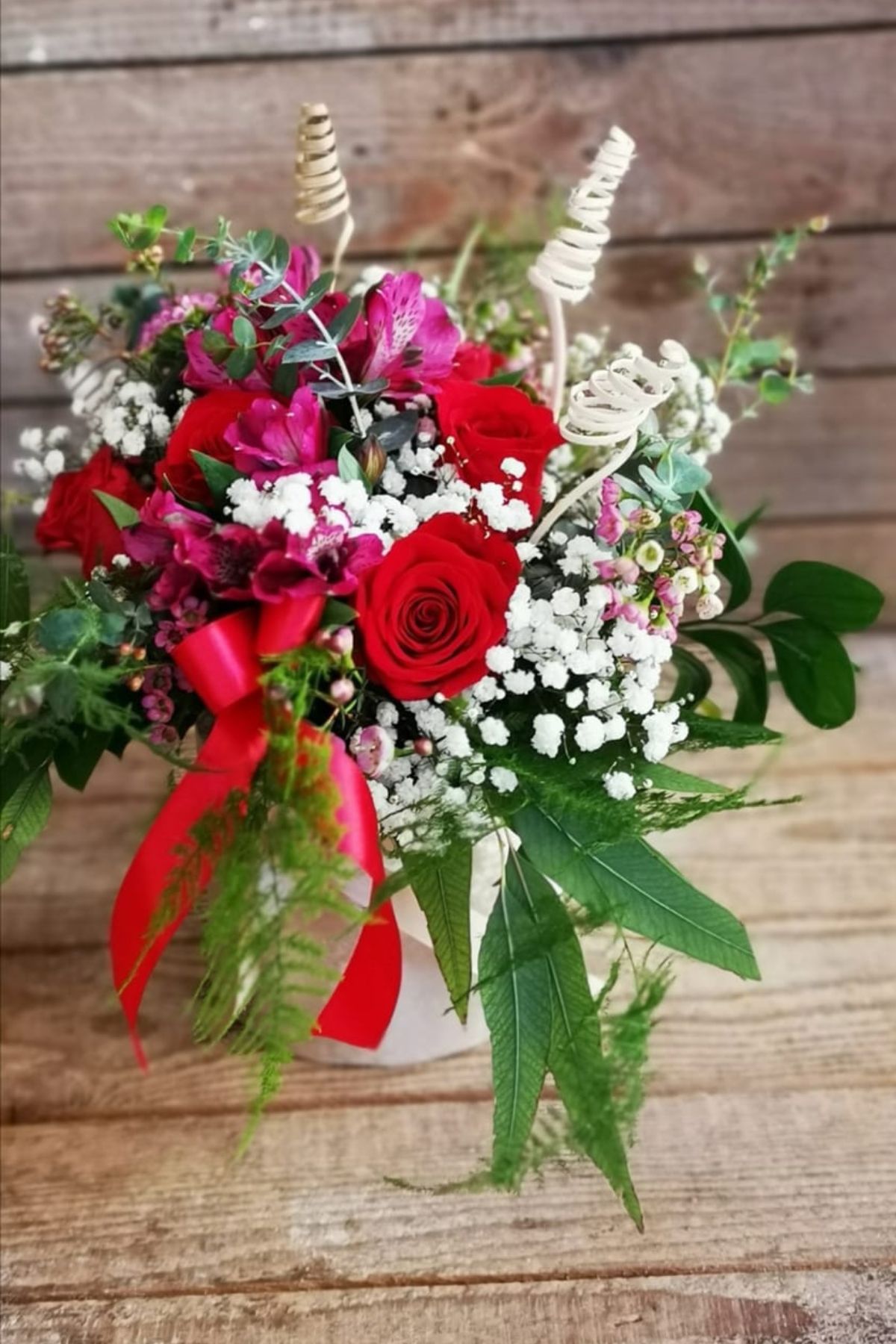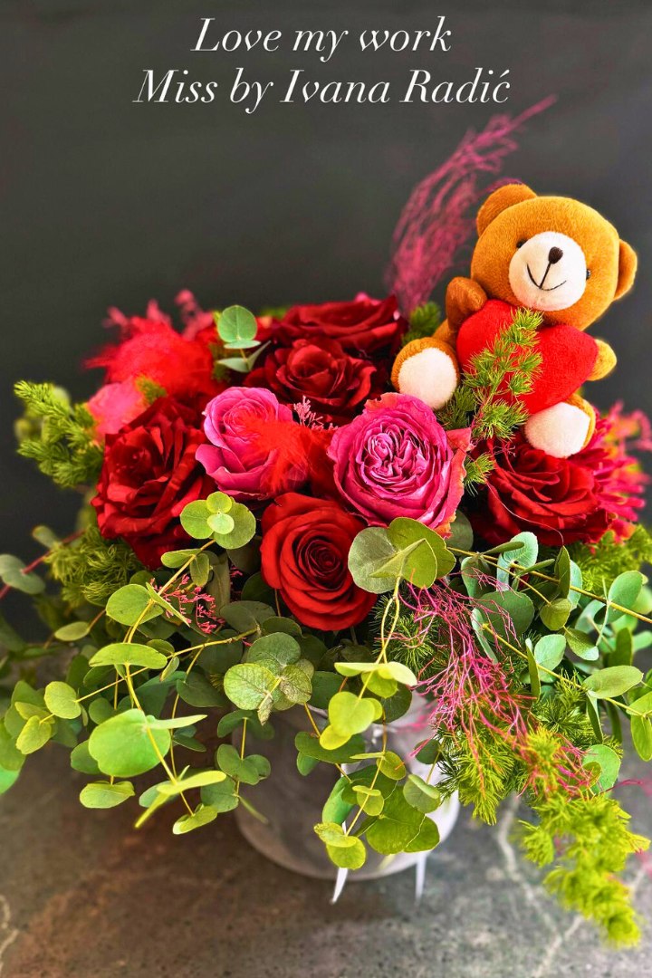Romantična cvjetna kutija u crveno-ružičnim tonovima s bogatim ružama, eukaliptusom i nježnim detaljima, upotpunjena preslatkim medvjedićem sa srcem. Idealno za Valentinovo, godišnjice ili kada želiš reći “volim te” bez puno riječi.