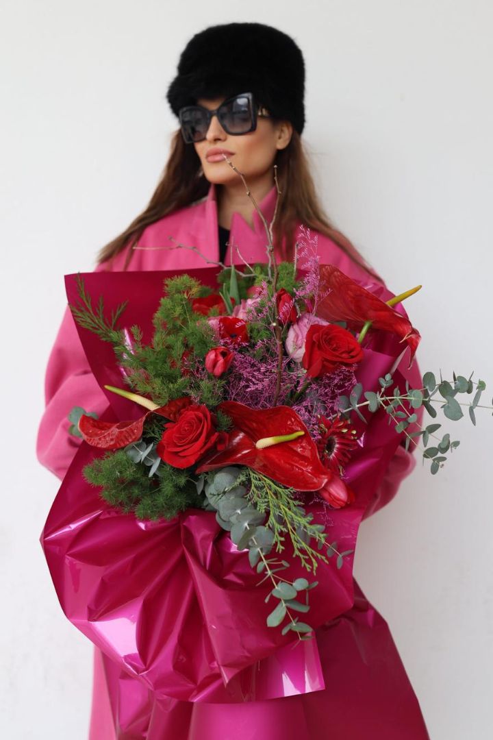 Ovaj raskošni buket odiše snagom, elegancijom i luksuzom. Crvene ruže, egzotični anturijumi, nježni tulipani i bogato zelenilo eukaliptusa čine savršenu kombinaciju strasti i sofisticiranosti. Umotan u sjajni fuksija papir, ovaj buket privlači pažnju i ostavlja snažan dojam.