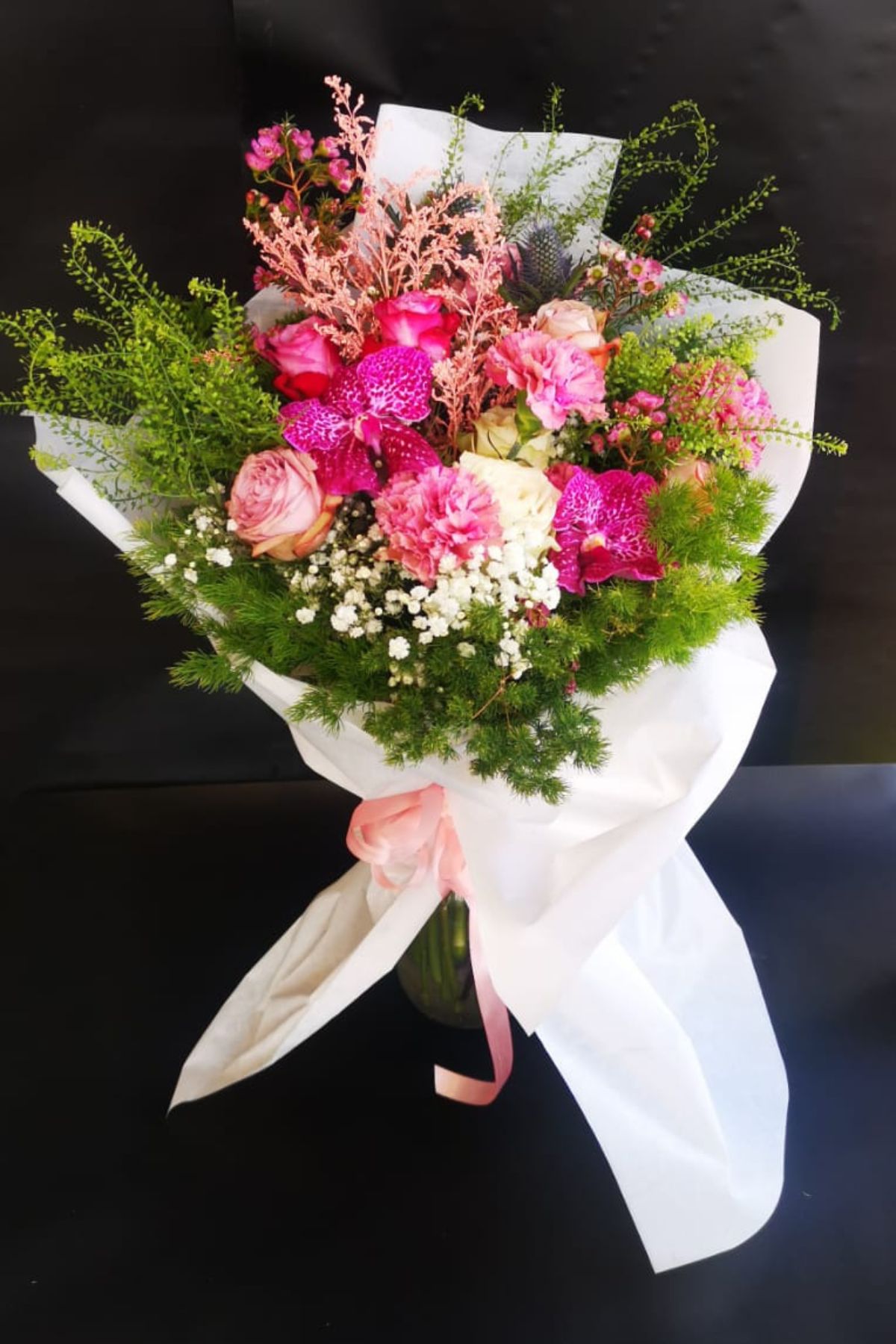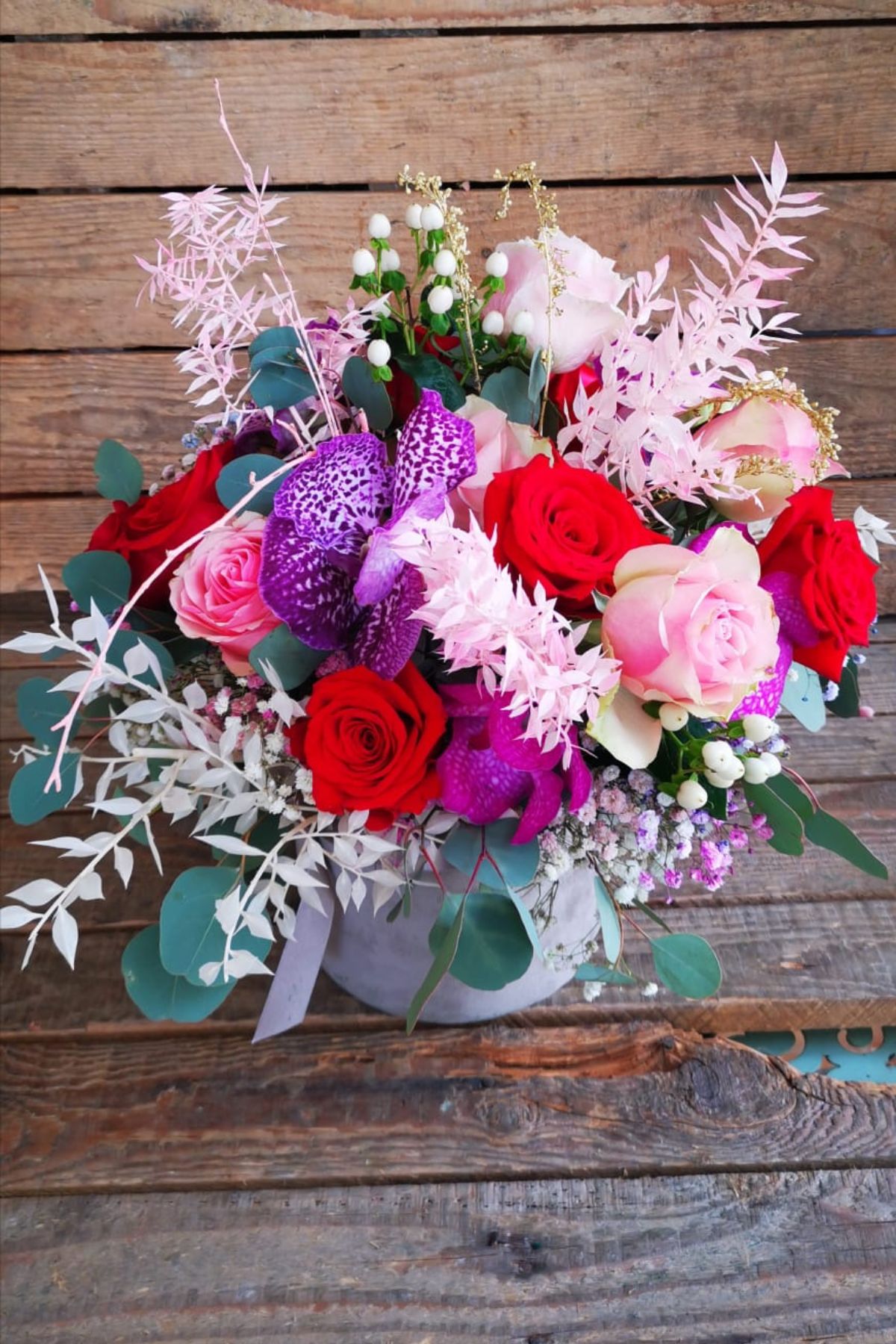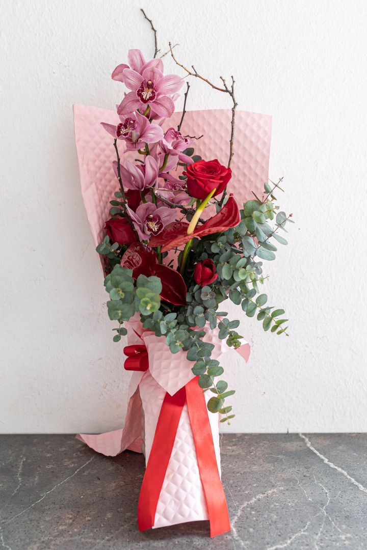 Ovaj profinjeni buket spaja sofisticiranost i prirodnu ljepotu kroz kombinaciju nježnih ružičastih orhideja, crvenih ruža i egzotičnih anturijuma, obogaćenih eukaliptusom i dekorativnim grančicama.