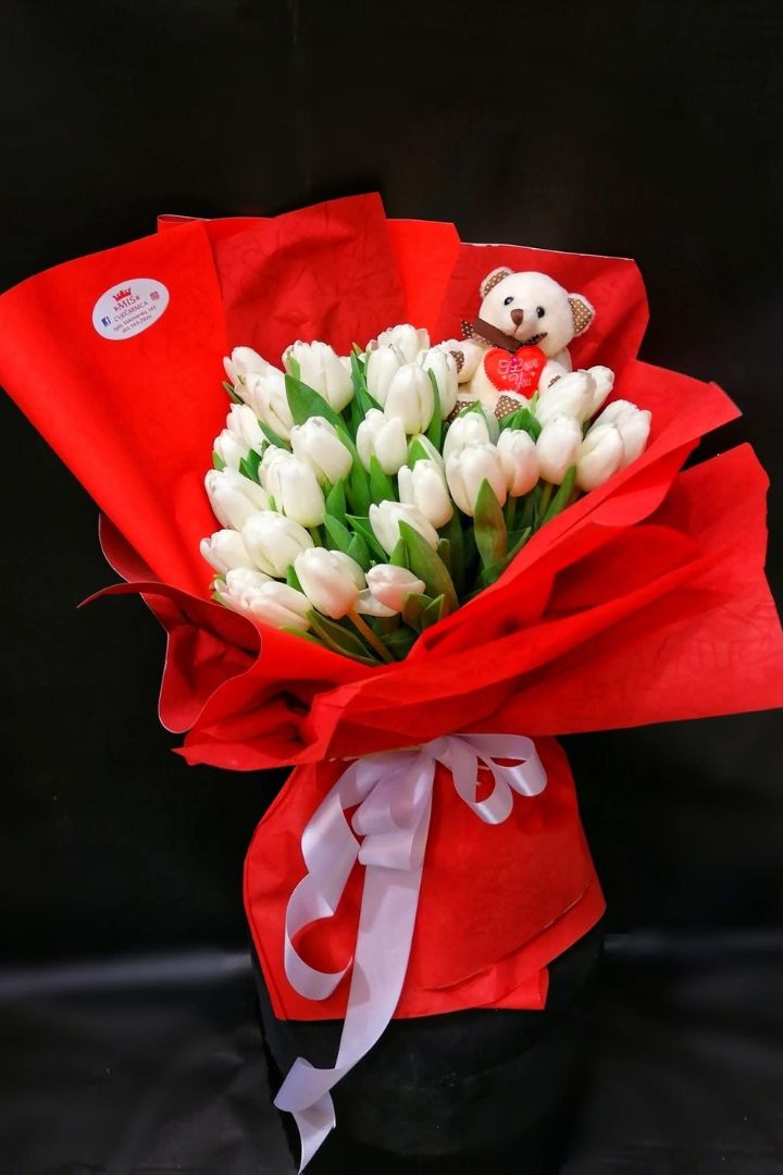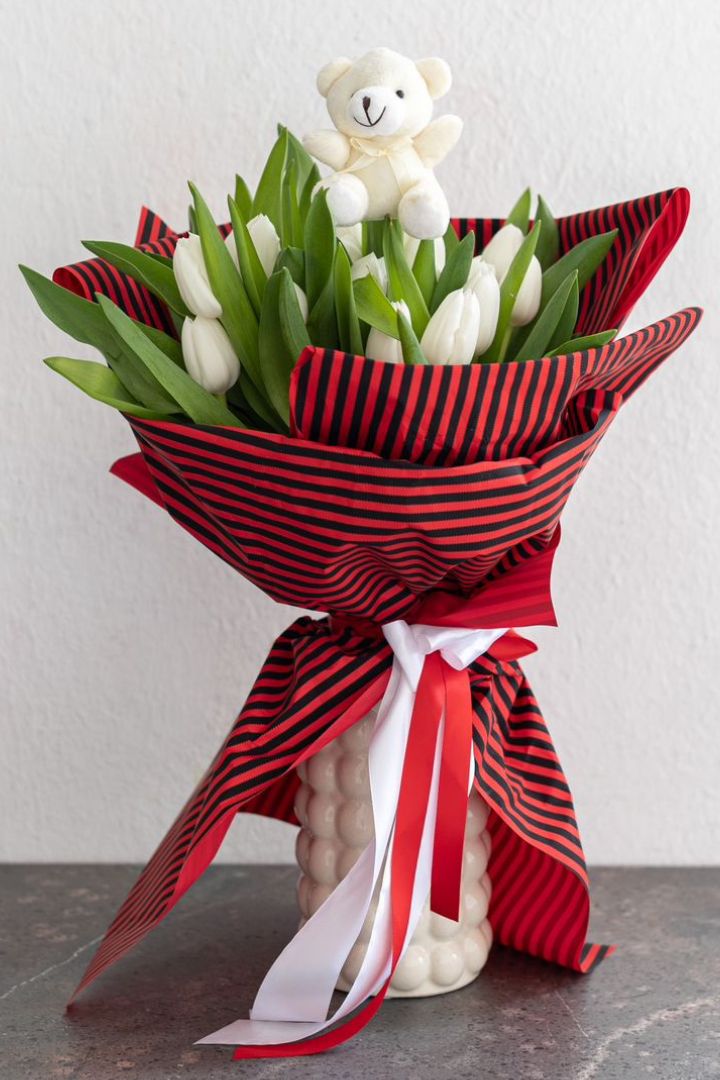 Ovaj predivni buket od bijelih tulipana, umotan u elegantni crveno-crni papir, odiše nježnošću i elegancijom. Poseban detalj – mali plišani medvjedić – čini ga savršenim poklonom za izražavanje ljubavi, pažnje i topline.