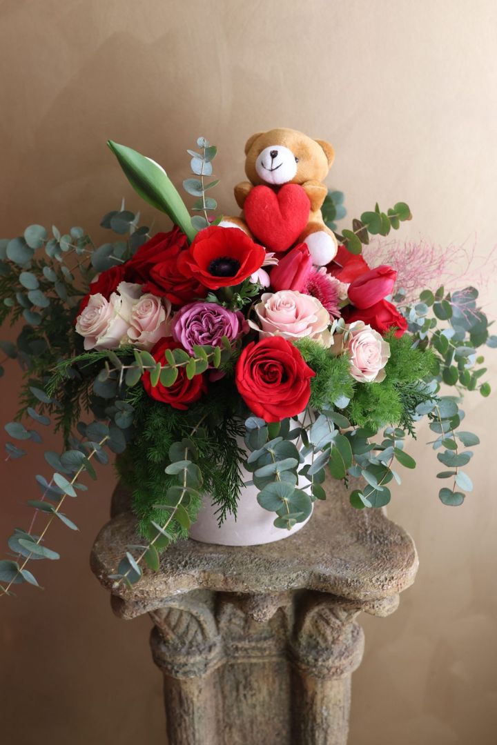 Poklonite emociju uz prekrasan flower box pun ljubavi i nježnosti! Aranžman sastavljen od elegantnih crvenih i pastelnih ruža, anemona i sezonskog zelenila, upotpunjen slatkim plišanim medvjedićem koji drži srce.