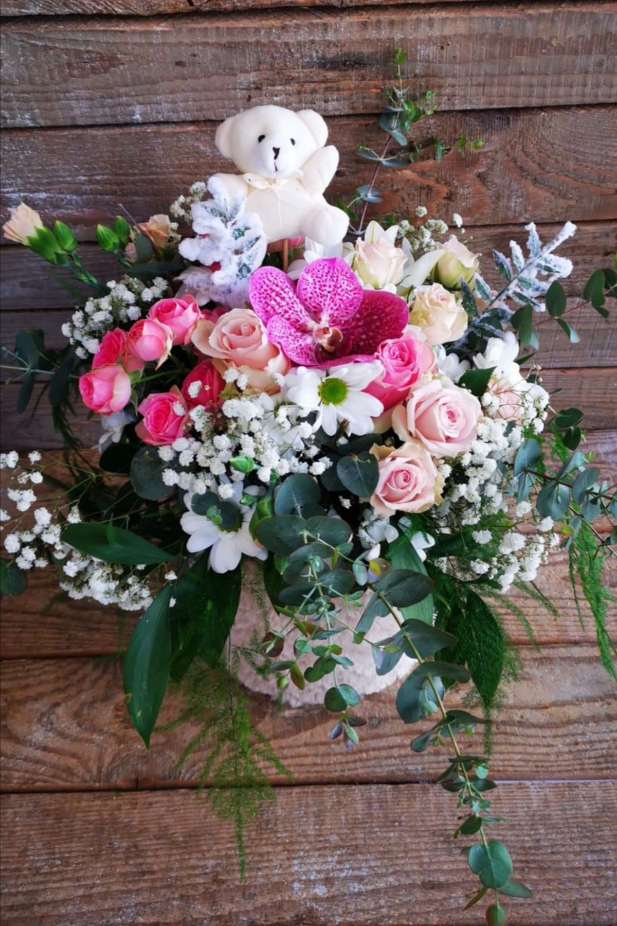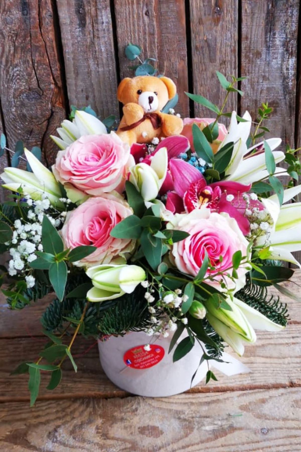 Šarmantan buket s raskošnim cvijećem, zelenilom i plišanim medvjedićem – idealan za darivanje i posebne trenutke.