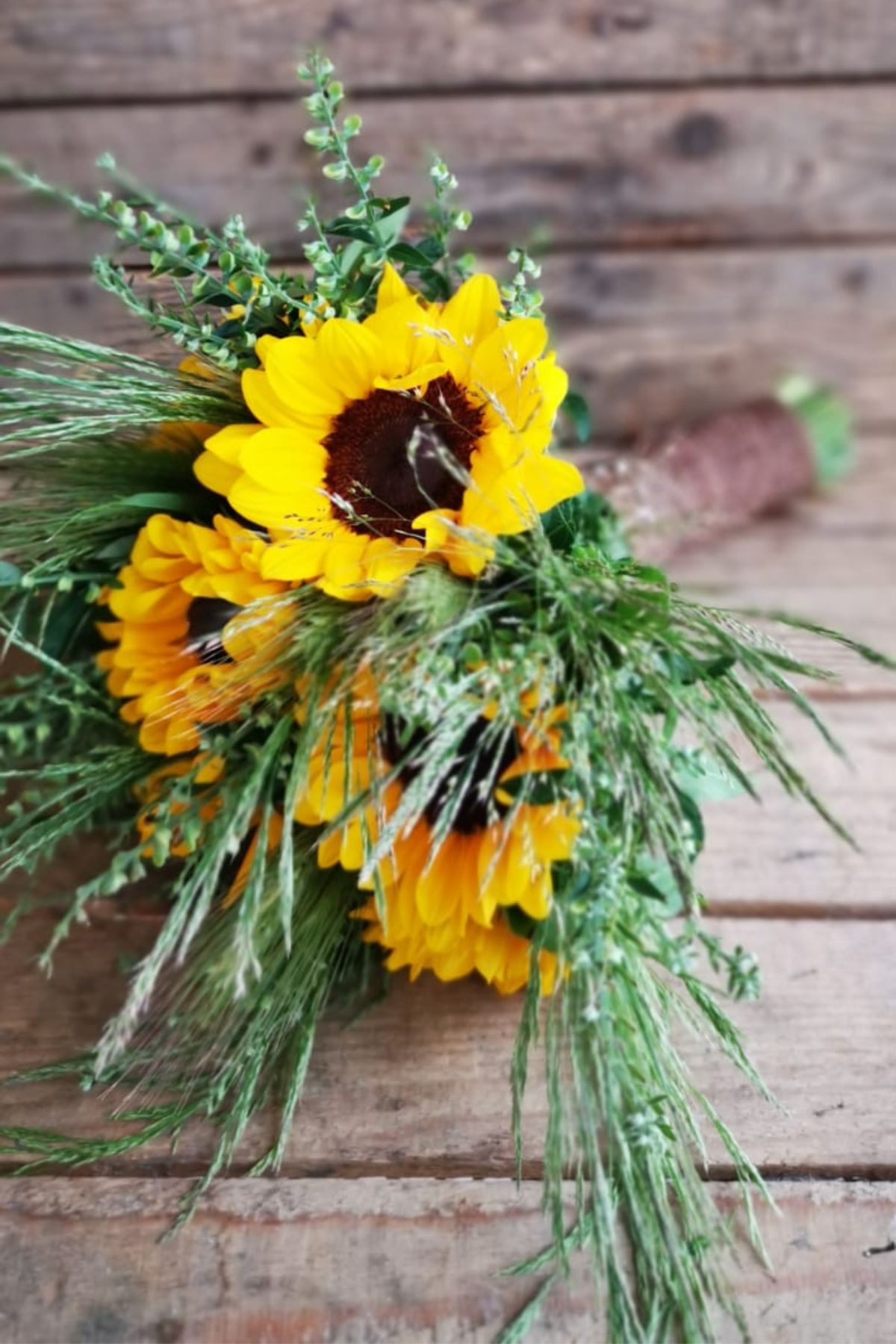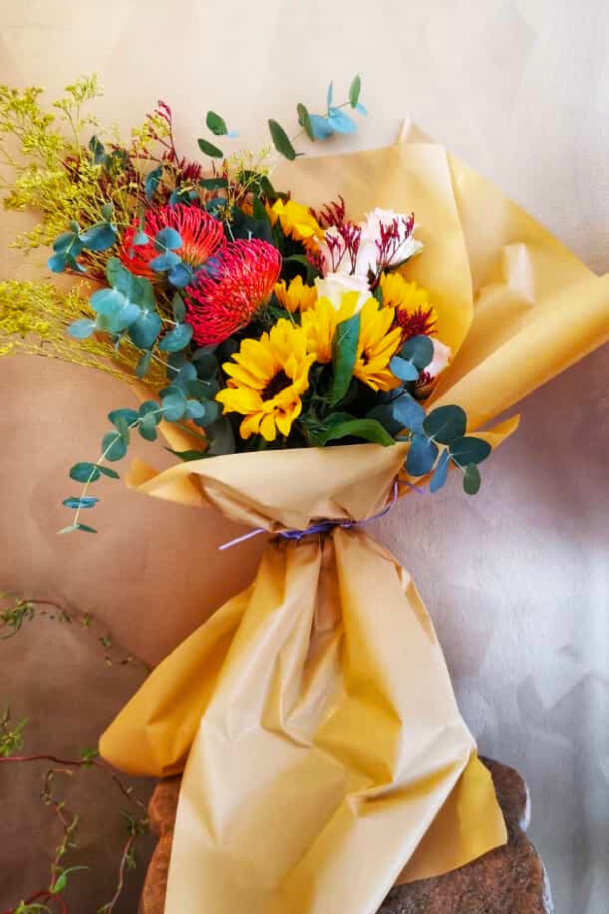 Vedri buket sa suncokretima, proteom, kalama i ljiljanom u zelenilu eukaliptusa. Topao i elegantan poklon za svaku prigodu.