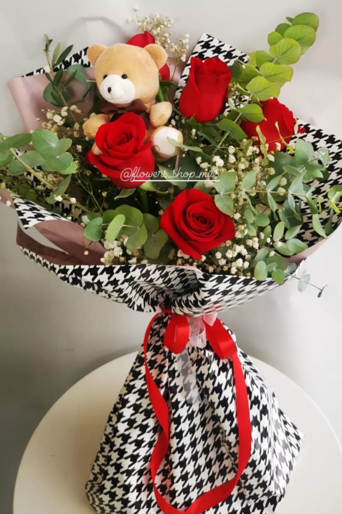 Romantičan buket raskošnih crvenih ruža, obogaćen nježnim detaljima gipsofile i eukaliptusa, uz slatkog plišanog medvjedića kao simbol pažnje i topline. Savršen izbor za Valentinovo, rođendane, godišnjice ili kada želite pokloniti osmijeh i zagrljaj u jednom buketu.