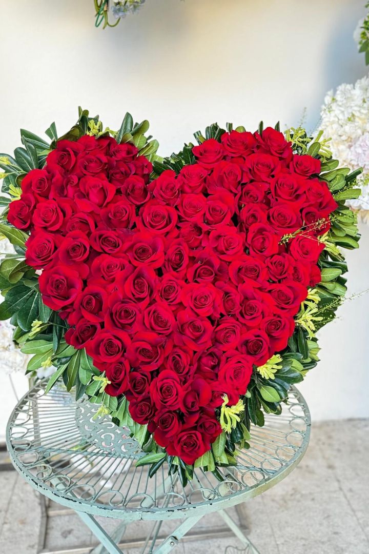 Romantična cvjetna kompozicija od crvenih ruža, eukaliptusa i dekorativnog zelenila, s detaljem srca kao simbolom ljubavi. Savršen poklon za Valentinovo i posebne trenutke.
