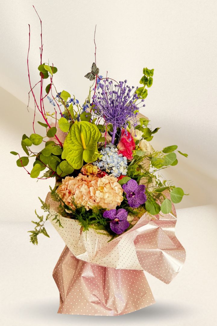 Raskošni buket u veselim tonovima s hortenzijama, vanda orhidejama, anthuriumom i lizijantusom. Savršen izbor za darivanje ili dekoraciju posebnih trenutaka. Zamotan u elegantno pakiranje s ružičastim točkicama.