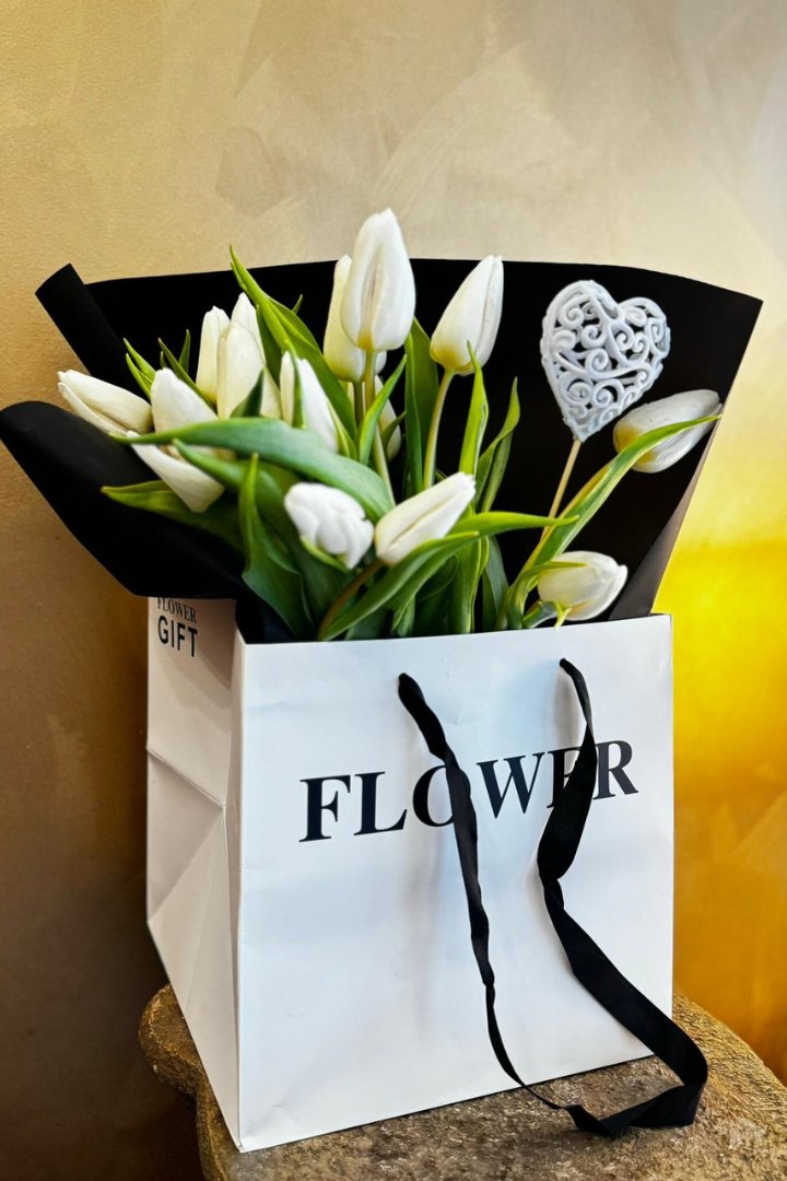 Nježna i elegantna kompozicija bijelih tulipana u dekorativnoj gift vrećici. Minimalistički, profinjen poklon koji prenosi čistoću, pažnju i suptilnu romantiku.