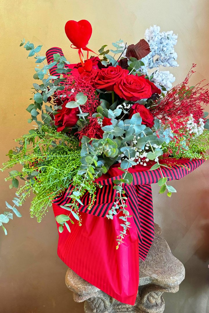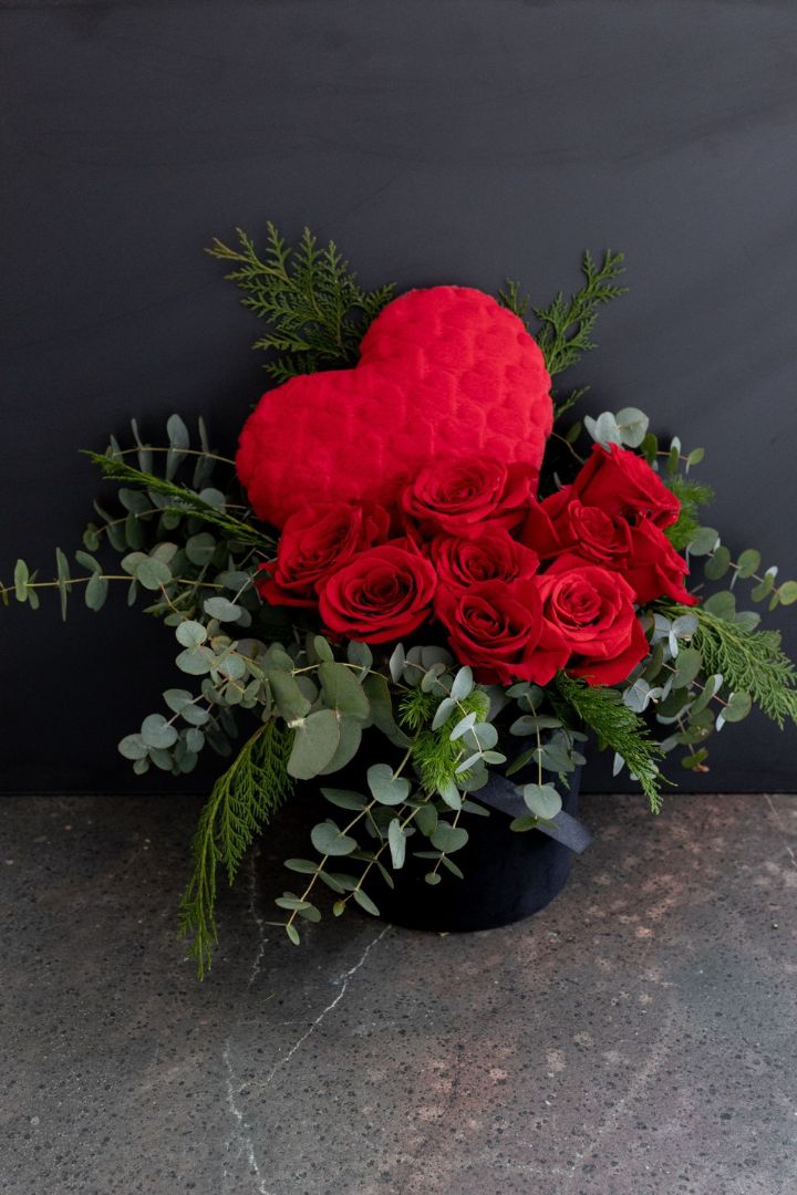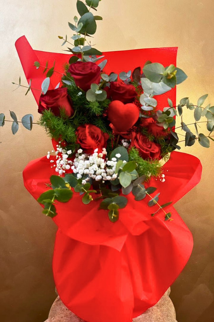 Romantična cvjetna kompozicija od crvenih ruža, eukaliptusa i dekorativnog zelenila, s detaljem srca kao simbolom ljubavi. Savršen poklon za Valentinovo i posebne trenutke.