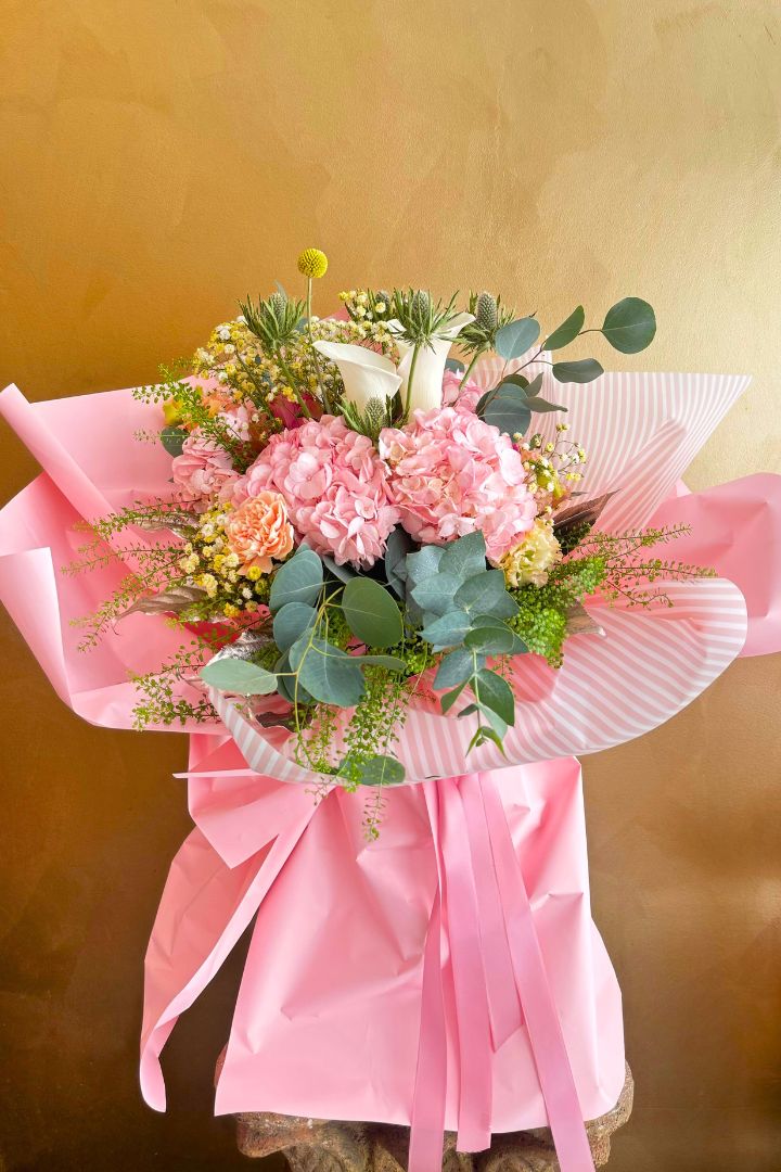 Ružičasti buket s hortenzijama, kalama i eukaliptusom, omotan u elegantni roza papir. Nježan, profinjen i savršen za svaku posebnu prigodu.