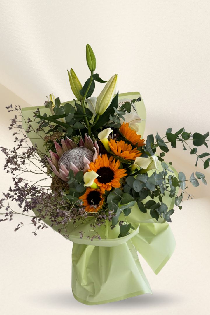 Vedri buket sa suncokretima, proteom, kalama i ljiljanom u zelenilu eukaliptusa. Topao i elegantan poklon za svaku prigodu.