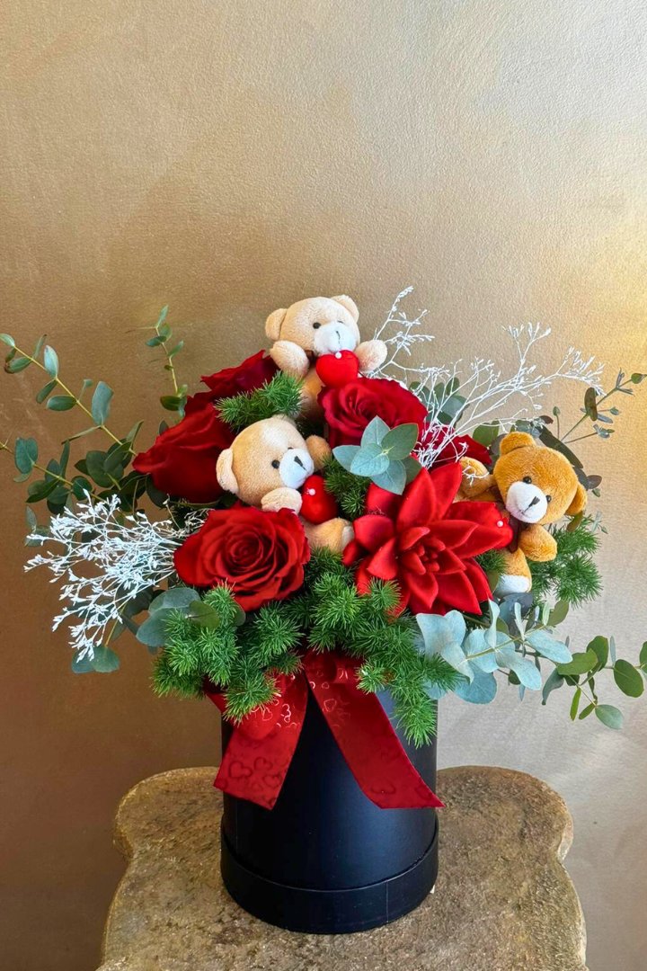 Romantična cvjetna kutija s crvenim ružama i tri plišana medića.