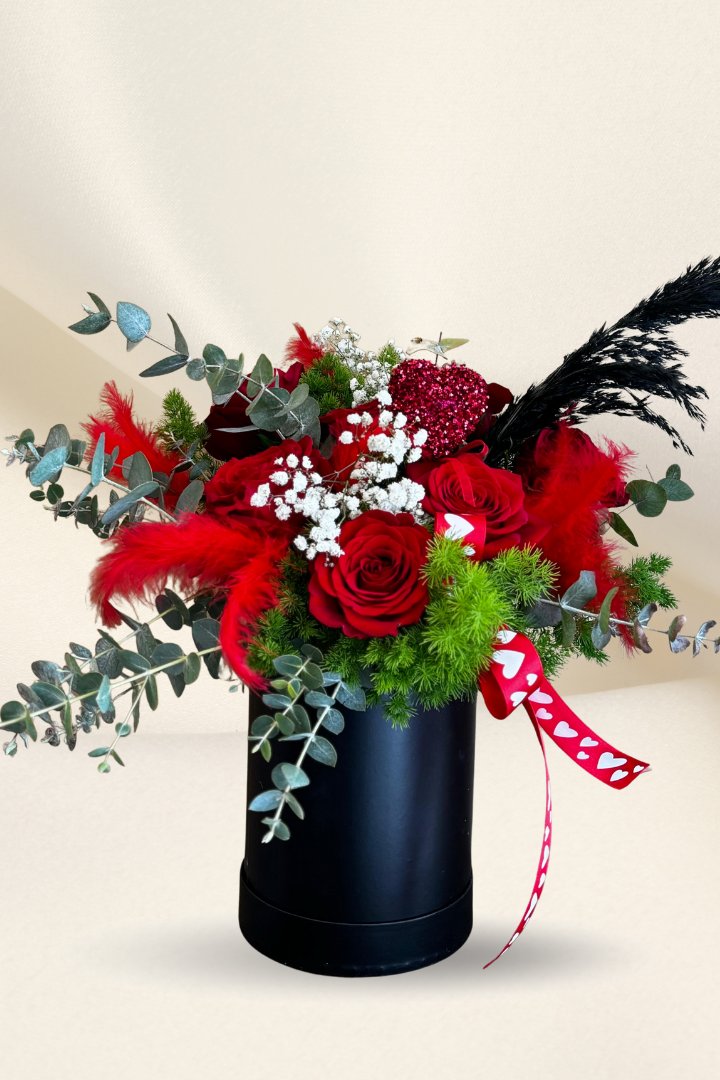 Strastveni aranžman crvenih ruža s nježnim detaljima gipsofile, eukaliptusa i dekorativnog perja. Dostupan u crvenoj ili crnoj kutiji, ovisno o dostupnosti u danom trenutku. Snažan, zavodljiv karakter – savršen poklon za Valentinovo i ostale prigode
