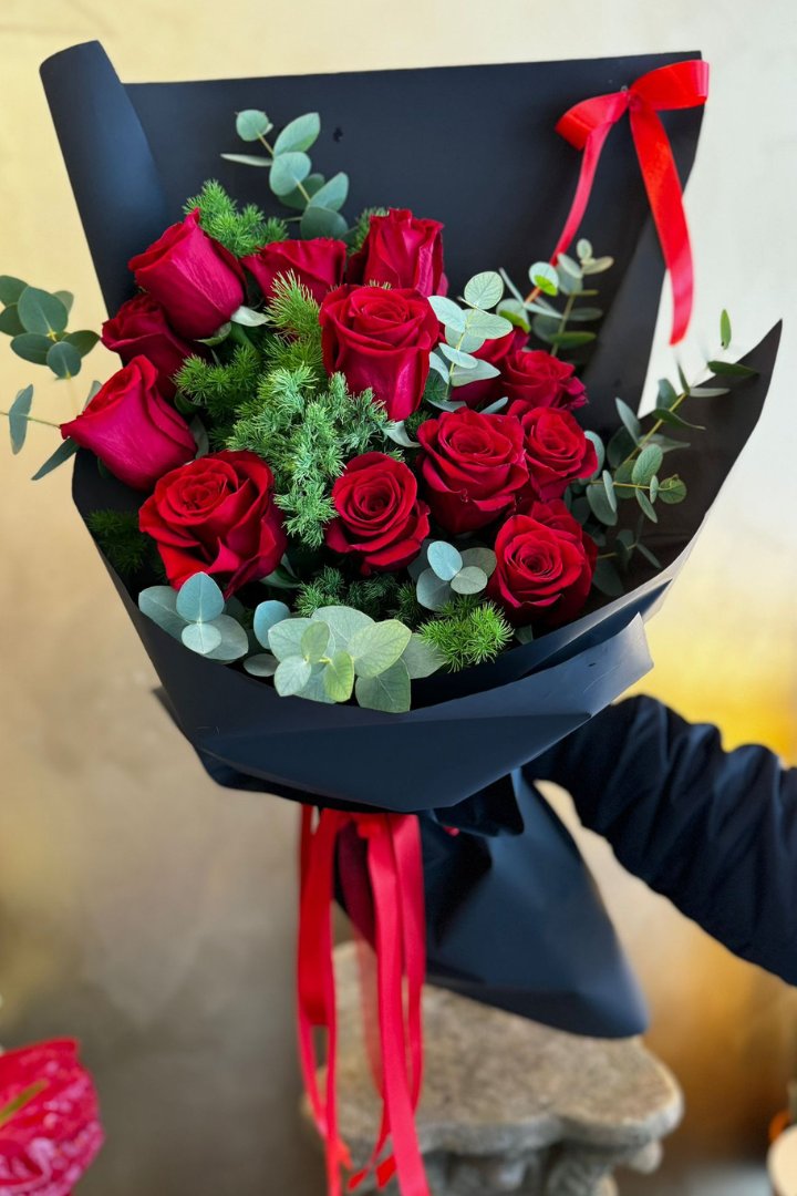 Impresivan buket raskošnih crvenih ruža, pažljivo oblikovan u punu, elegantnu formu i obogaćen grančicama eukaliptusa. Simbol duboke ljubavi, strasti i bezvremenske romantike. Savršen izbor za posebne trenutke kada želite ostaviti snažan dojam.