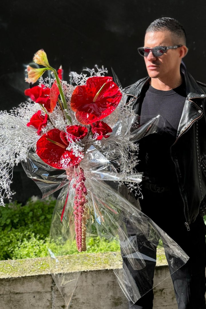 Snažan, zavodljiv buket crvenih ruža u kontrastu s tamnim pakiranjem i nježnim teksturama, inspiriran visokom modom i bezvremenskom elegancijom.