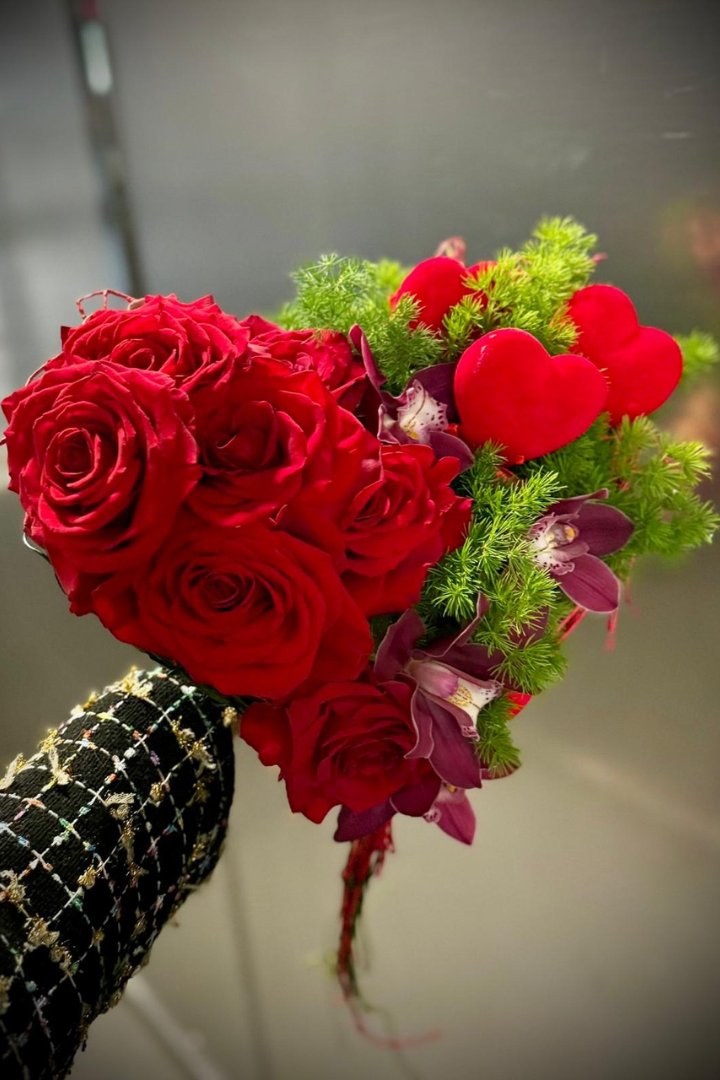 Ručni buket u obliku srca od raskošnih crvenih ruža, profinjenih orhideja i svježeg zelenila. Klasičan simbol ljubavi s modernim potpisom — snažan, romantičan i bezvremenski.