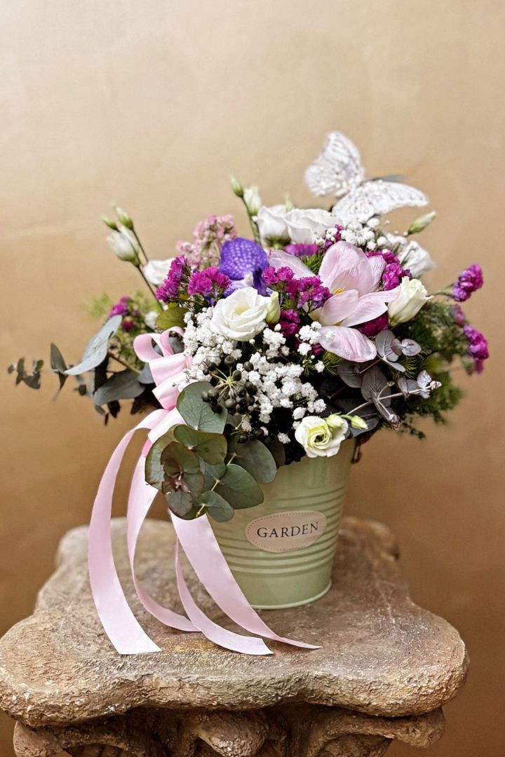 Nježan i razigran cvjetni aranžman u pastelnozelenoj tegli s natpisom “Garden”, savršen za poklon ili dekoraciju doma. Spoj ružičastih tulipana, bijelog lisianthusa, ljubičastih statica, gipsofile i eukaliptusa, ukrašen elegantnom rozom vrpcom i bijelim leptirićem koji dodaje posebnu čar. Idealno za rođendane, godišnjice ili kao znak pažnje koji ostavlja dojam topline i elegancije.