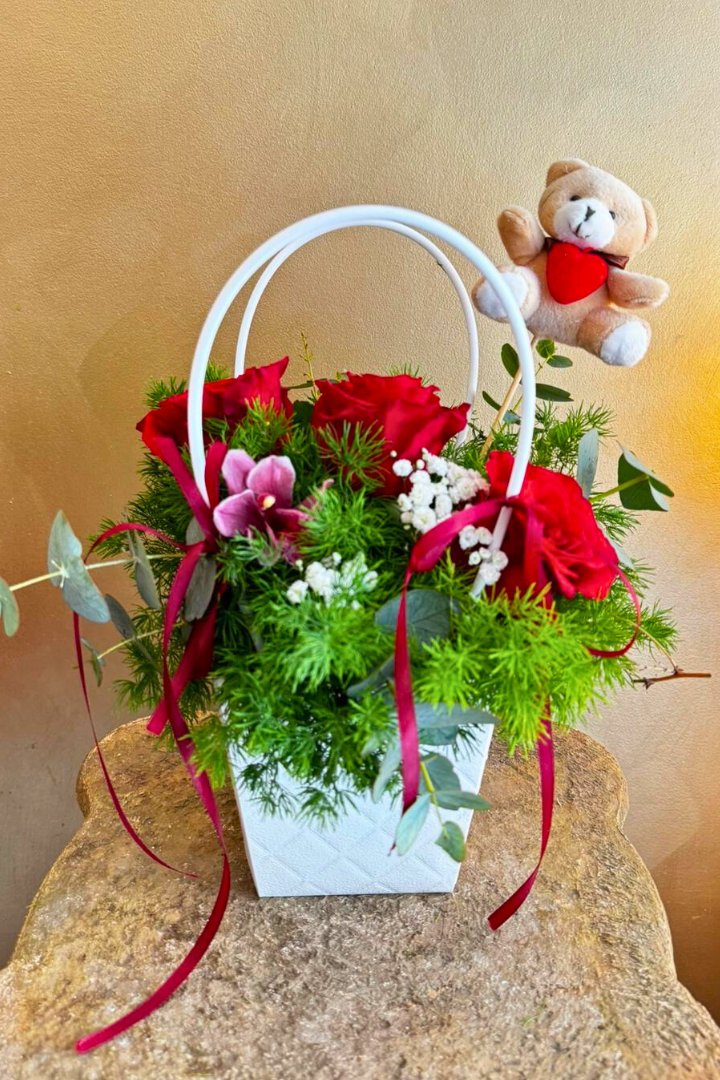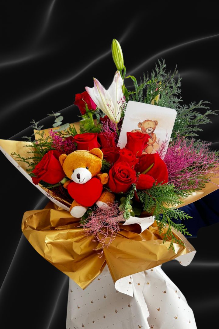 Ovaj predivan aranžman spaja crvene ruže, simbol strasti i ljubavi, s nježnim zelenilom eukaliptusa i čempresa. Kao poseban dodatak, plišani medvjedić s crvenim srcem donosi toplinu i emociju, čineći ovaj aranžman savršenim izrazom nježnosti i pažnje.