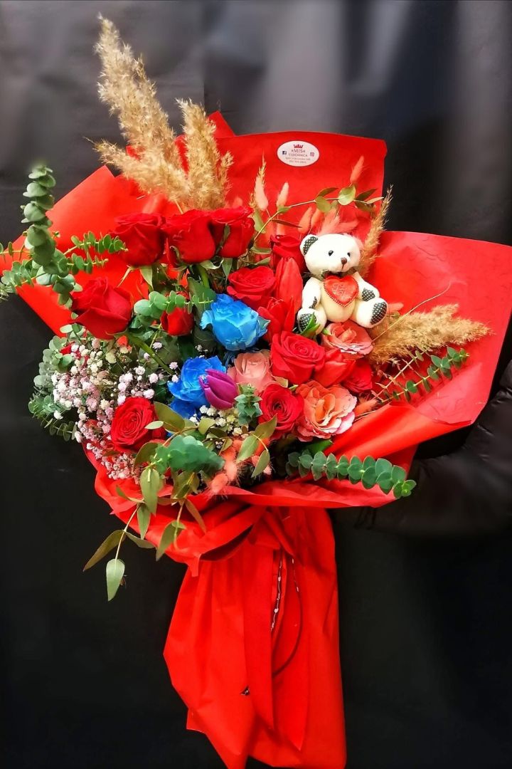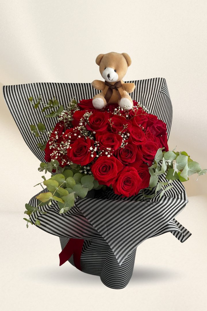 Romantičan buket raskošnih crvenih ruža, obogaćen nježnim detaljima gipsofile i eukaliptusa, uz slatkog plišanog medvjedića kao simbol pažnje i topline. Savršen izbor za Valentinovo, rođendane, godišnjice ili kada želite pokloniti osmijeh i zagrljaj u jednom buketu.