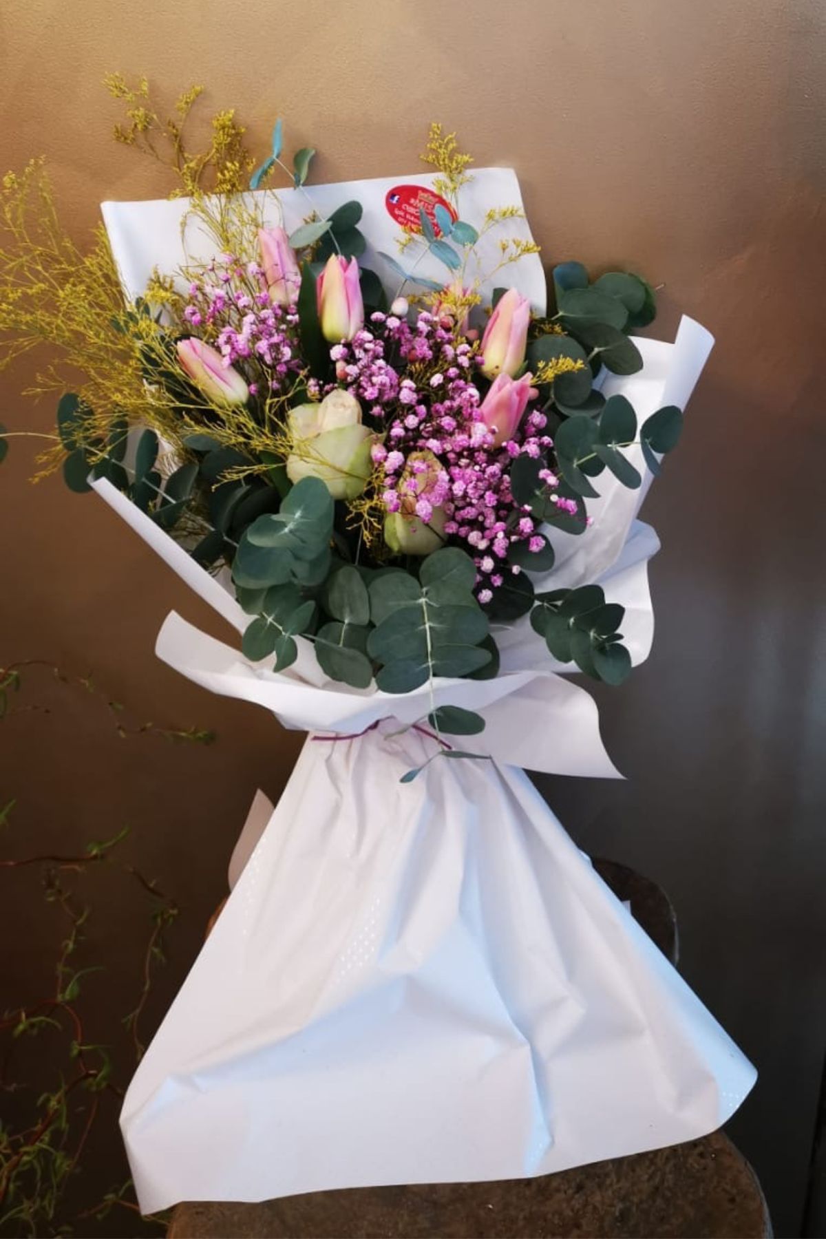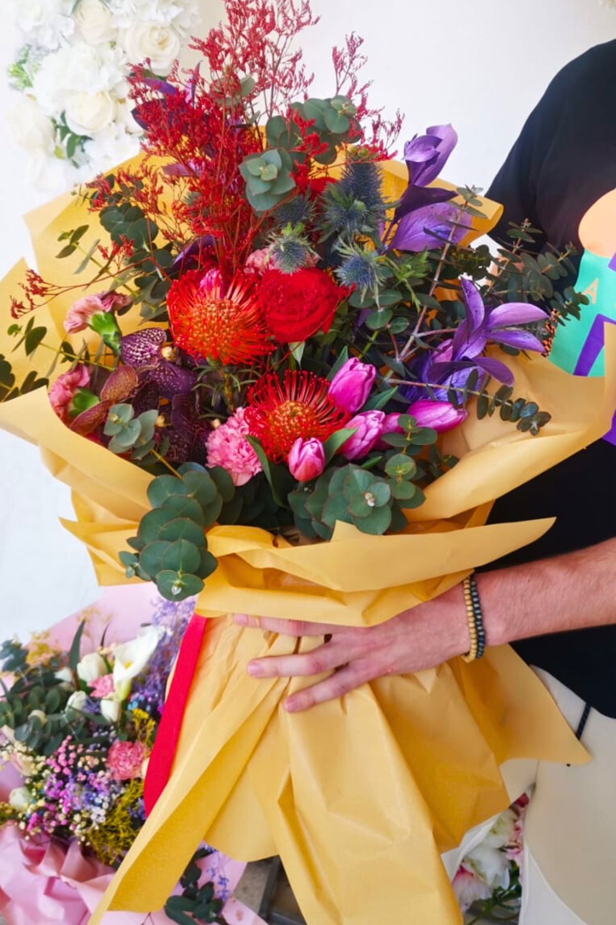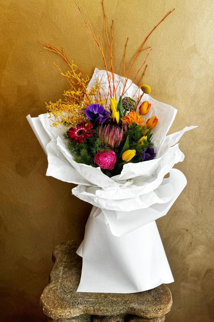 Šarmantni i vibrantni buket izrađen od raznolikog sezonskog cvijeća u toplim i živopisnim bojama. Kombinacija tulipana, anemona, protea, krizantema i delikatnog zelenila upotpunjena je dekorativnim grančicama i pažljivo umotana u elegantan bijeli papir. Idealan izbor za posebne prilike ili kao poklon koji ostavlja dojam.