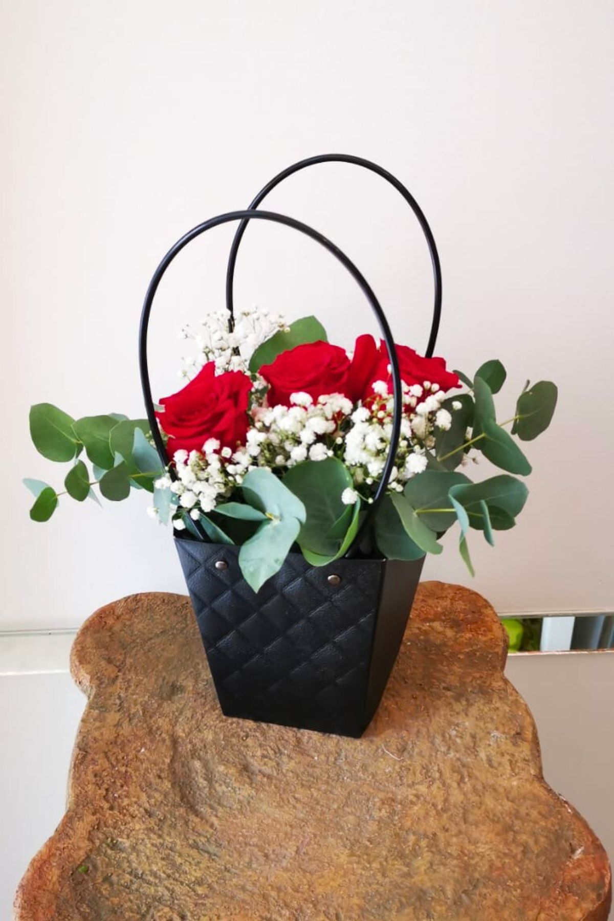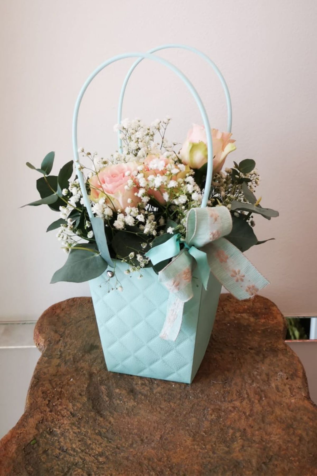 Cvjetna torbica koja priča svoju priču – ispunjena nježnim ružama u ljubičastim tonovima, svježim eukaliptusom i sitnim cvjetovima koji unose dašak romantike. Elegantna mašna zaokružuje cijelu kompoziciju i čini ovaj aranžman savršenim poklonom za svaku posebnu priliku.