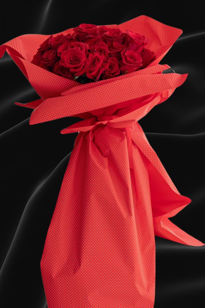 Ovaj luksuzni buket crvenih ruža, umotan u elegantni crveni papir s diskretnim uzorkom, simbol je ljubavi, strasti i sofisticiranosti.