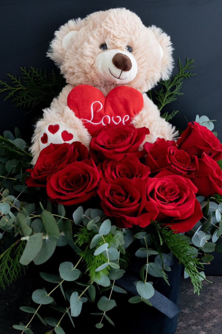 Romantična cvjetna kutija u crveno-ružičnim tonovima s bogatim ružama, eukaliptusom i nježnim detaljima, upotpunjena preslatkim medvjedićem sa srcem. Idealno za Valentinovo, godišnjice ili kada želiš reći “volim te” bez puno riječi.