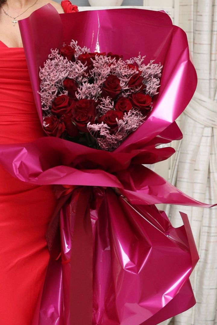 Ovaj luksuzni buket crvenih ruža, okružen nježnim ružičastim detaljima i elegantno zamotan u sjajni ružičasti papir, savršen je simbol ljubavi, strasti i profinjenosti.