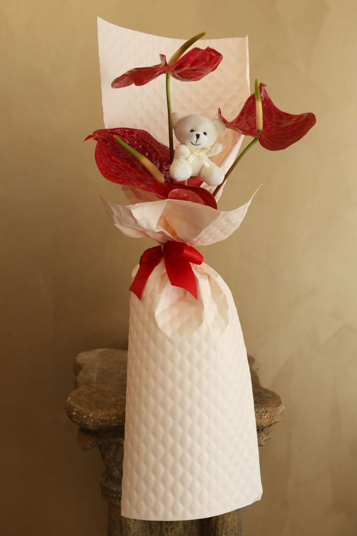 Ovaj sofisticirani buket s crvenim Anthurium cvjetovima odiše elegancijom i posebnim stilom. Minimalistički, ali upečatljiv dizajn dodatno je obogaćen slatkim plišanim medvjedićem, što ga čini idealnim poklonom za Valentinovo, godišnjicu ili znak pažnje voljenoj osobi.