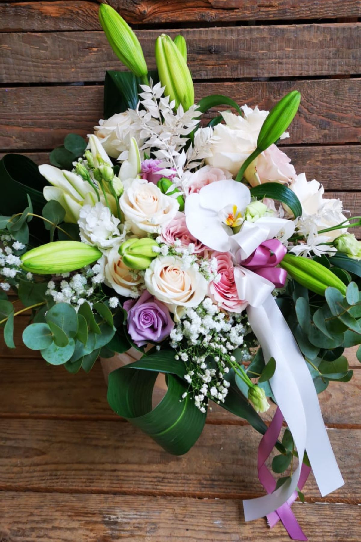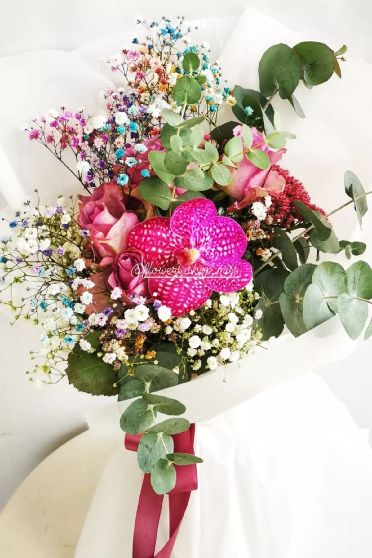 Ovaj profinjeni buket spaja sofisticiranost i prirodnu ljepotu kroz kombinaciju nježnih ružičastih orhideja, crvenih ruža i egzotičnih anturijuma, obogaćenih eukaliptusom i dekorativnim grančicama.