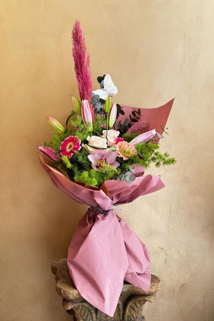 Elegantni buket s dominacijom ružičastih tonova, savršen za posebne trenutke. Kombinacija raskošnih ljiljana, ruža, gerbera i upotpunjena zelenilom, eukaliptusom i visokim dekorativnim cvijetom pampasa. Pažljivo omotan u papir u boji starog roze, dodatno ukrašen leptirićem za dozu nježnosti. Idealno za rođendane, godišnjice ili kao znak pažnje voljenoj osobi.
