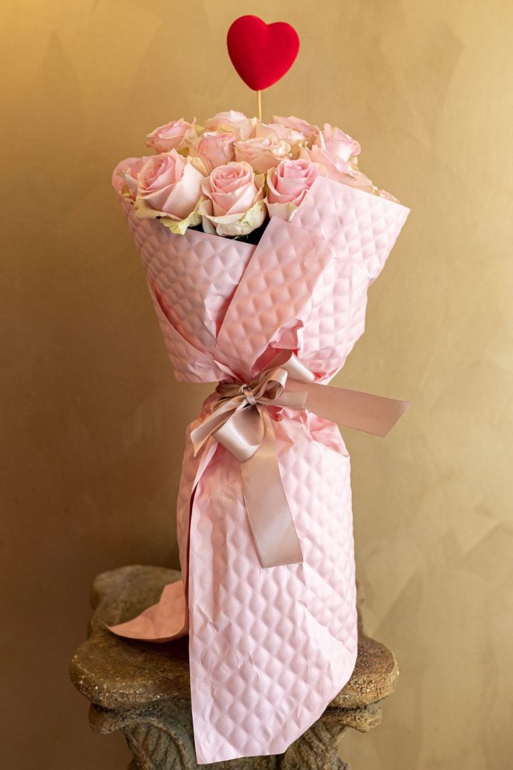 Oduševite voljenu osobu ovim elegantnim buketom nježnih roza ruža, pažljivo aranžiranim u luksuzno rozo pakiranje sa satenskom vrpcom.