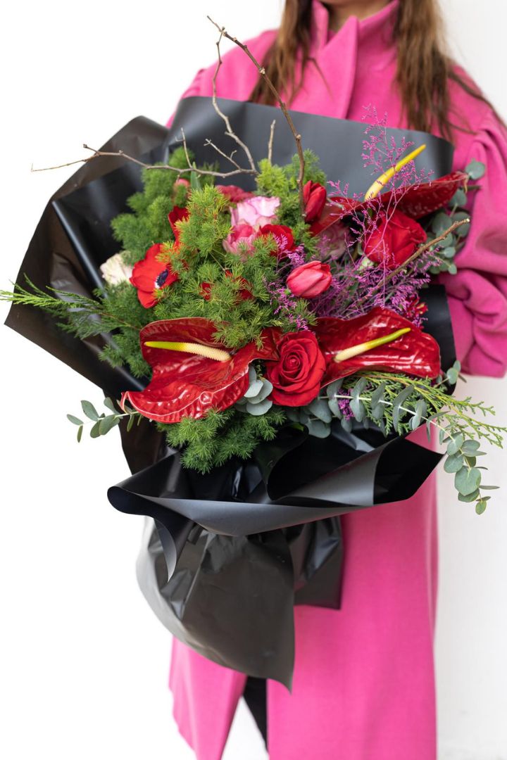 Ovaj raskošni buket odiše snagom, elegancijom i luksuzom. Crvene ruže, egzotični anturijumi, nježni tulipani i bogato zelenilo eukaliptusa čine savršenu kombinaciju strasti i sofisticiranosti. Umotan u sjajni fuksija papir, ovaj buket privlači pažnju i ostavlja snažan dojam.