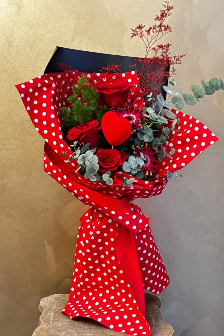 Ovaj predivan cvjetni aranžman spaja crvene ruže, simbol strasti i romantike, s nježnim zelenilom eukaliptusa i čempresa, stvarajući elegantan i sofisticiran izgled. Mekano crveno srce, smješteno među cvjetovima, daje posebnu toplinu i emotivnu poruku ljubavi.